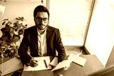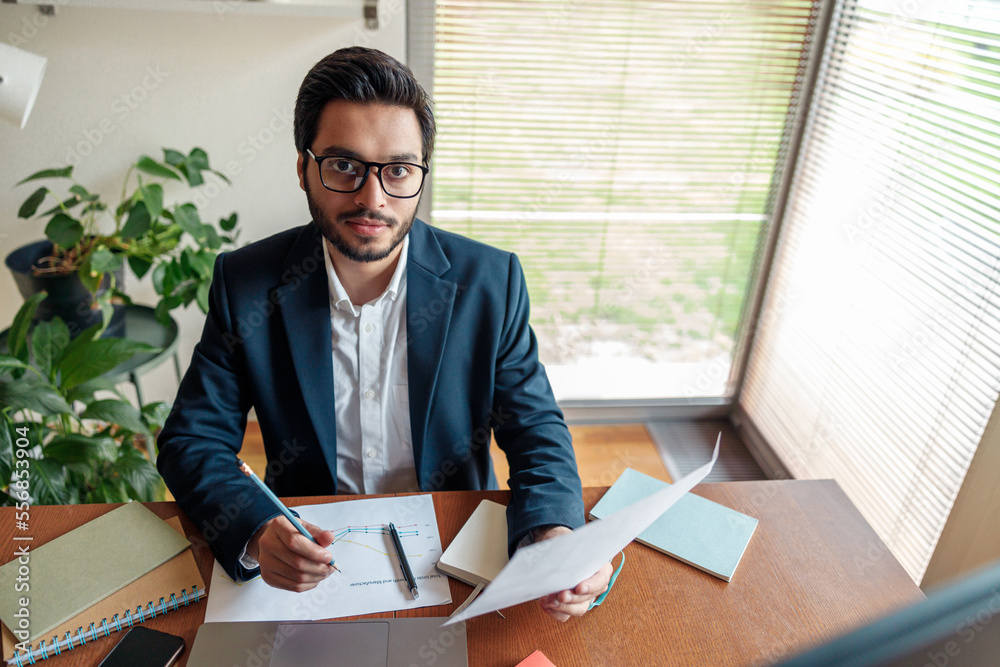 Handsome indian businessman in suit working on project from home office . Freelance concept