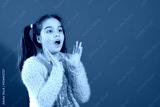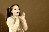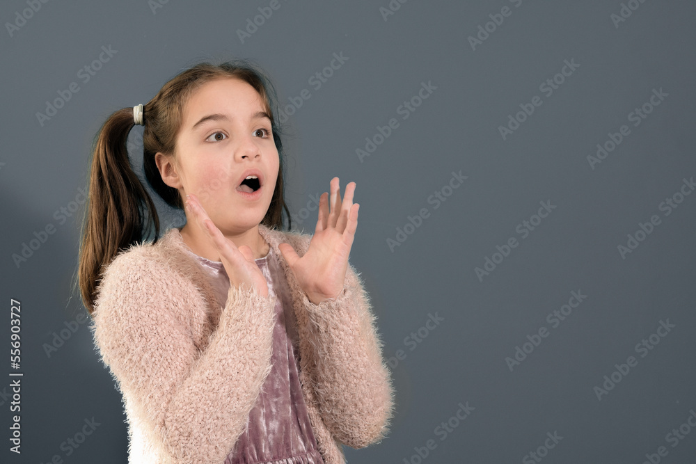 Portrait of a cute teenage girl in a pink sweater dressed in old style with surprise and admiration on her face
