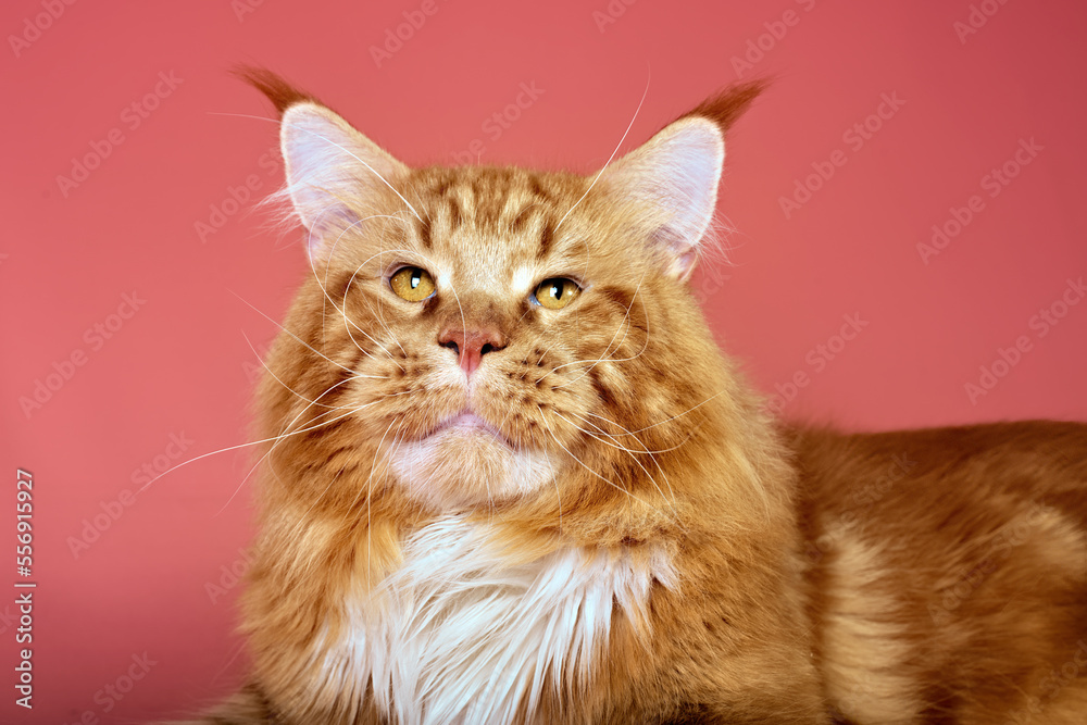 A big maine coon cat resting on pink background.