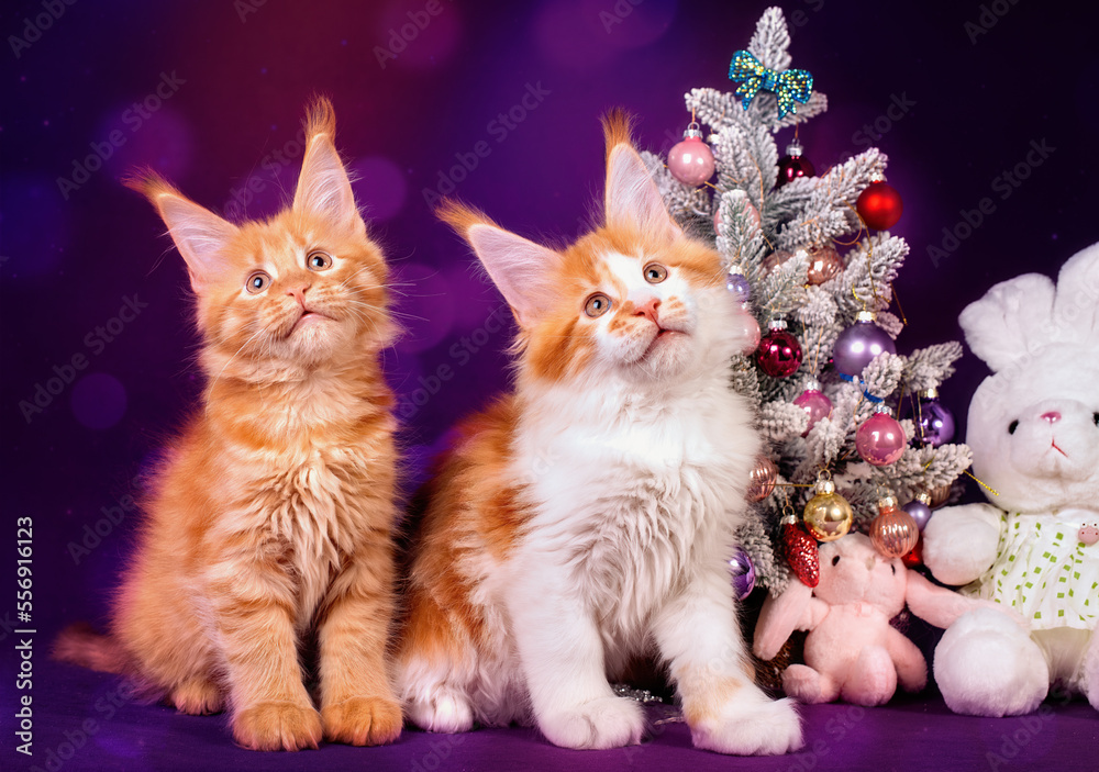 Beautiful Maine Coon kittens on the background of the Christmas tree and rabbit symbols of the New Year.