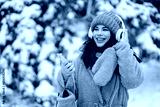 Pretty young long-haired woman in pink coat enjoy winter day and listening music with headphones at snowy park
