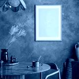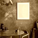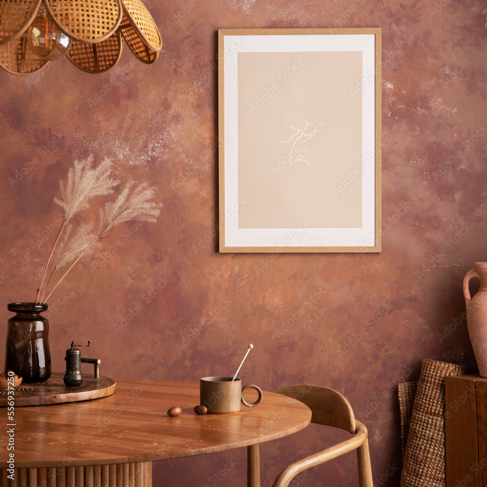 Stylish boho vintage dining room interior with poster mock up. Round table with chair, vase with dried flowers. Brown wall and straw lamp. Mock up poster. Template.