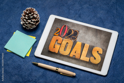 2023 goals - New Year resolutions and goal setting concept - word abstract in vintage letterpress wood type on a digital tablet