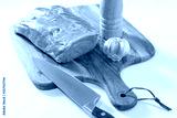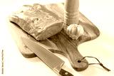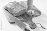 Fresh pork tenderloin stuffed with fresh garlic cloves. White table, wooden cutting board. Head of garlic and wooden manual pepper shaker.
