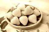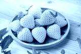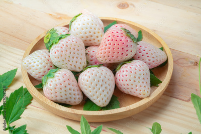 Fresh Pink Snow Strawberry in wooden plate on wooden background, White and Pink snow Strawberries on wooden Background.