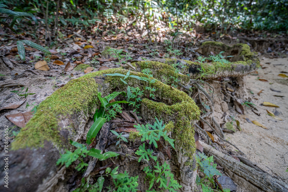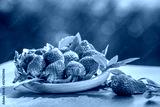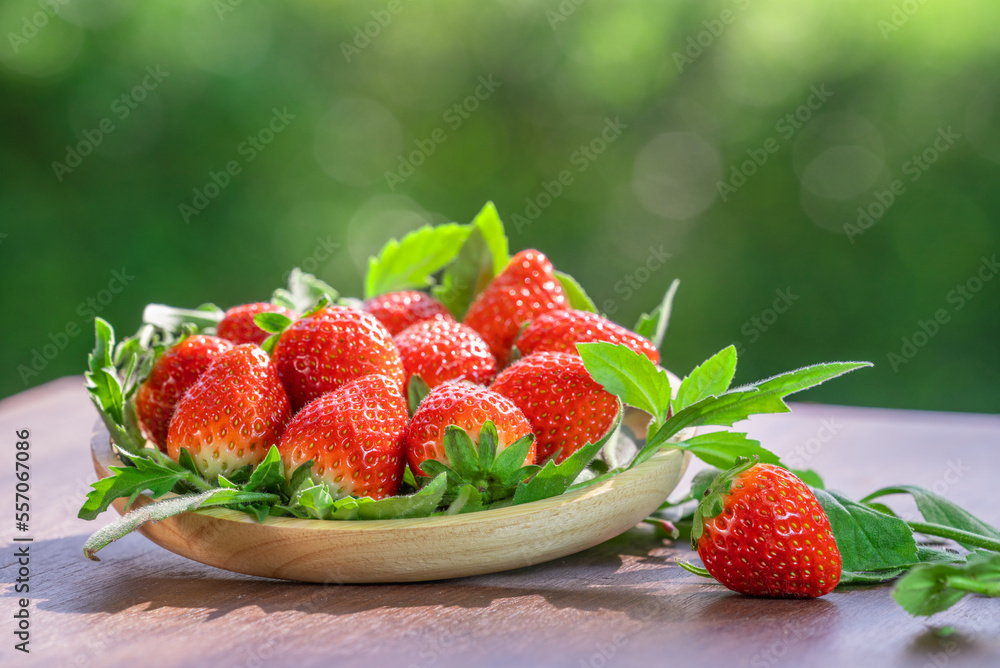 Red strawberry in wooden basket on blurred greenery background, Red Strawberries on wooden table in garden.