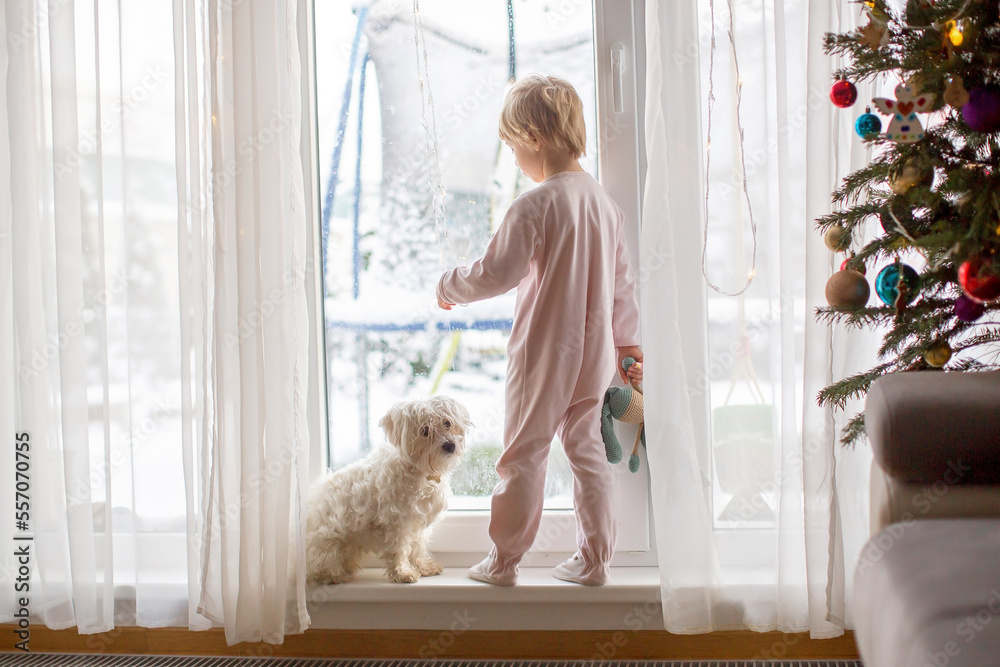 Cute toddler boy in pajama, standing in front of a big french windows with his pet dog, enjoying the snow
