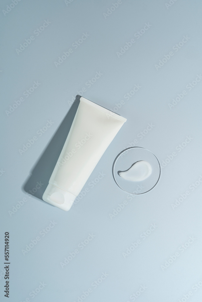 A white tube of cream and a smudge of it lying on a piece of glass. Beauty concept. Cosmetics mockup