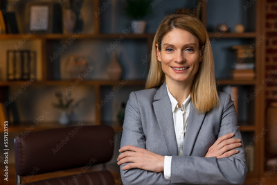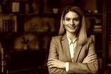 Young businesswoman in suit posing with arms folded, looking at camera and smiling. Female leadership concept
