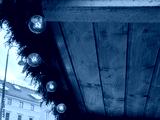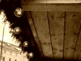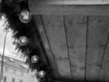 Close up of a Christmas garland with vintage edison style lightbulbs on a wooden roof at x-mas market in the city