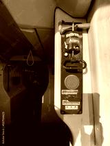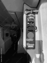 Vertical shot of red emergency alarm in city public transport, copy space