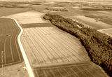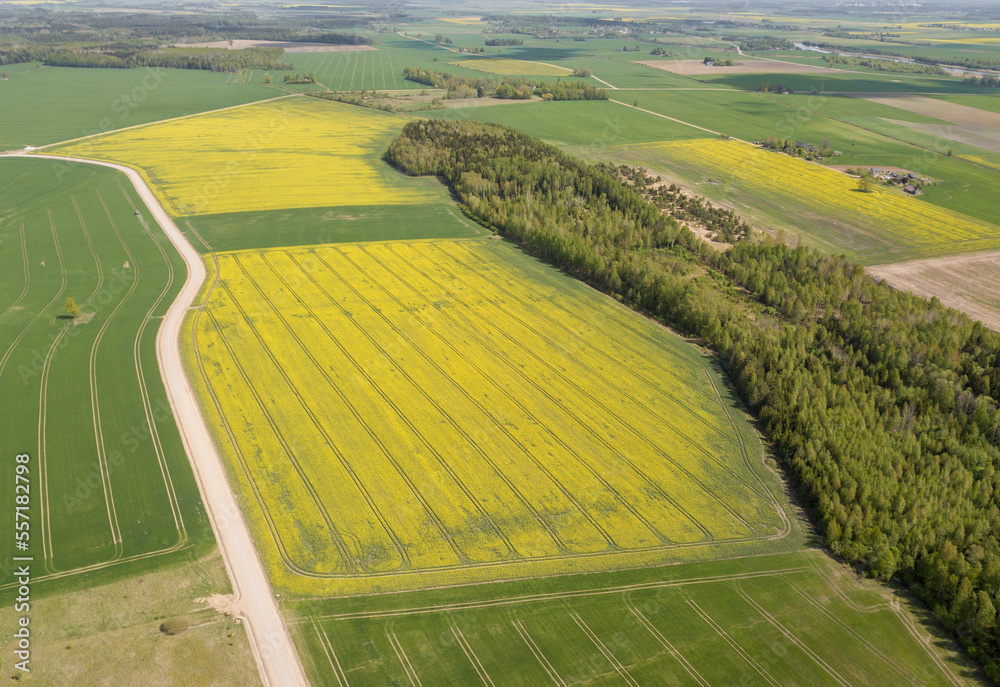 Aerial drone shot of big rape field in Latvia, Baltic States