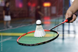 Badminton player holds racket and white cream shuttlecock in front of the net before serving it to another side of the court.