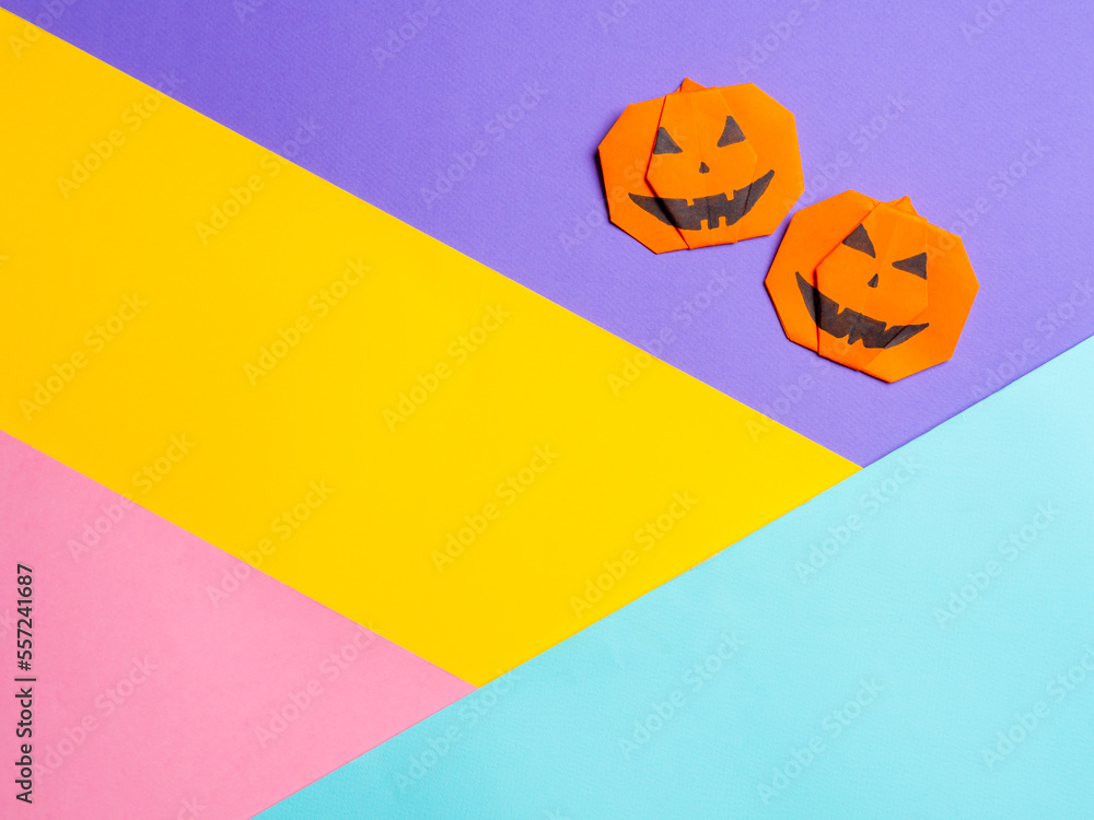 Halloween concept. Paper origami pumpkin on colorful background. Simple idea for halloween - easy made paper pumpkins on multicolor background. Copy space for text.
