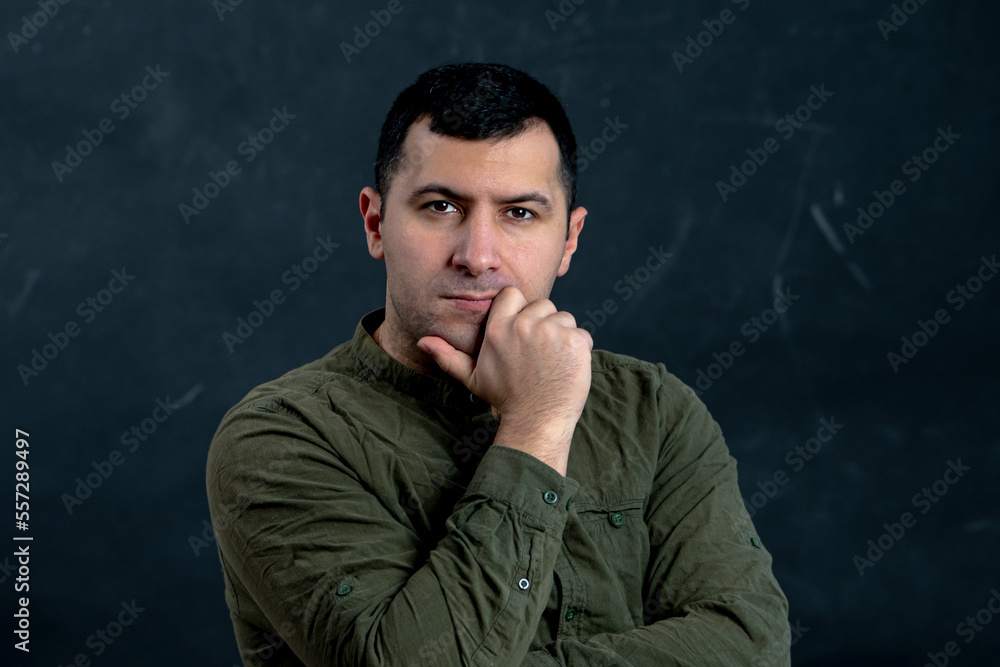 a thoughtful man 30-35 years old looks at the camera on a black background.