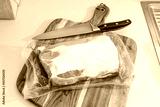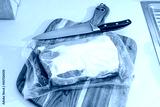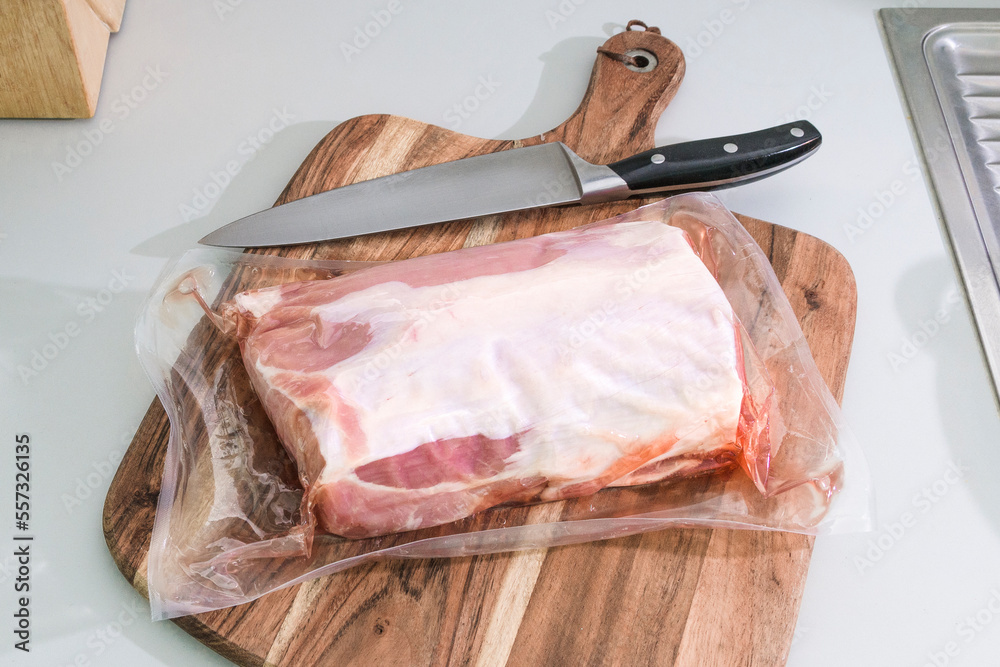 A piece of vacuum-packed pork tenderloin on a cutting board in the kitchen before cooking