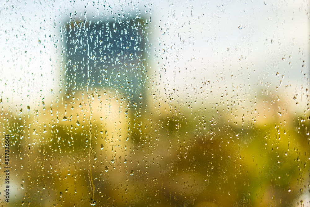 Colourful raindrops on the blurry background of the city in autumn