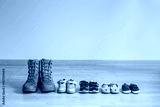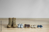 Old worn military boots and lot of baby shoes on wooden floor. Military father and family concept.