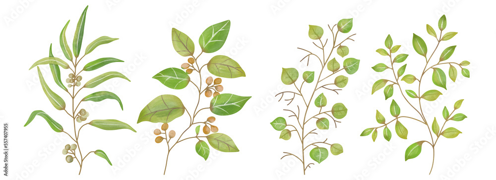 Watercolor Leaves Green, Branch painting leaf art