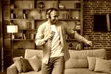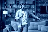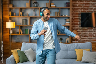Guy singing song holding phone listening to music online wearing headphones dancing and having fun at home. Music lover concept
