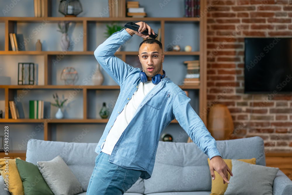 Young african american man in headphones dancing at home, funny african american guy holding phone, enjoying new hit song