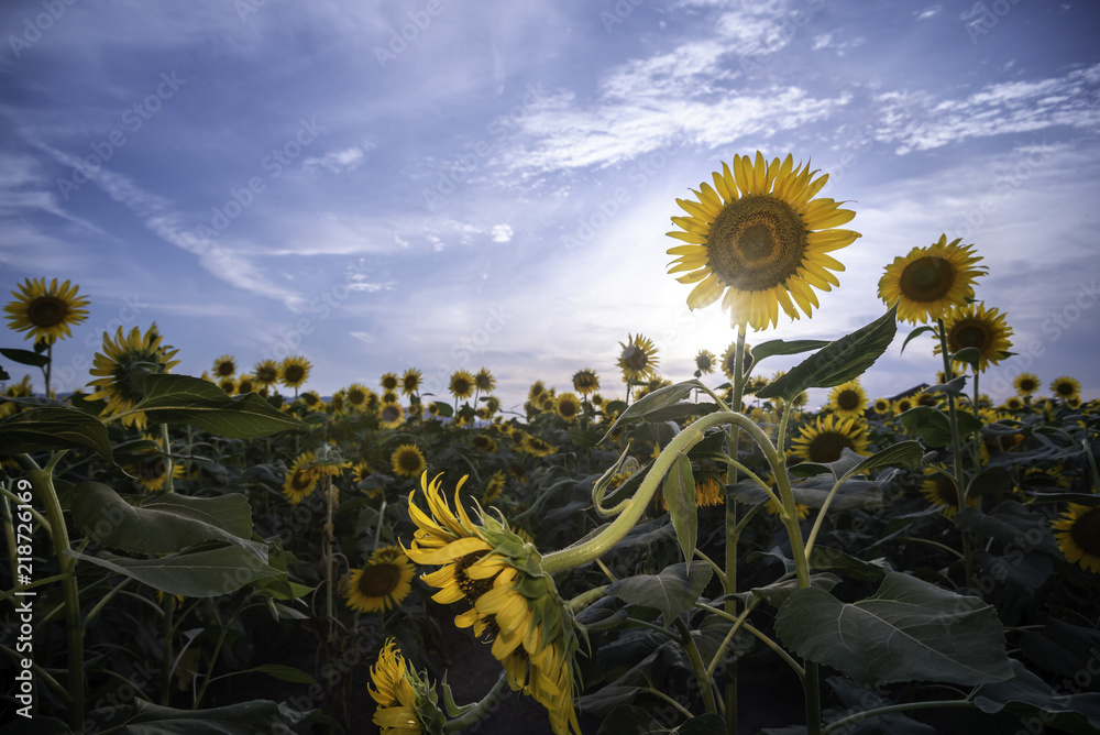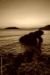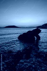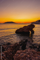 Big stone cliff sprouting out of the water in Mediterranean sea in Greece with yellow and orange sunset in background