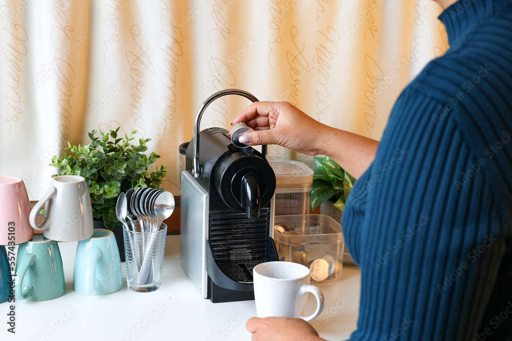 Closeup female hand insert espresso coffee capsule into automatic espresso machine to make fresh coffee at coffee bar at home or office in the morning. Technology and lifestyle concept.