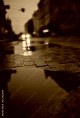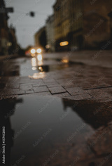 Moody vertical photo of puddle in autumn in city of Riga