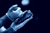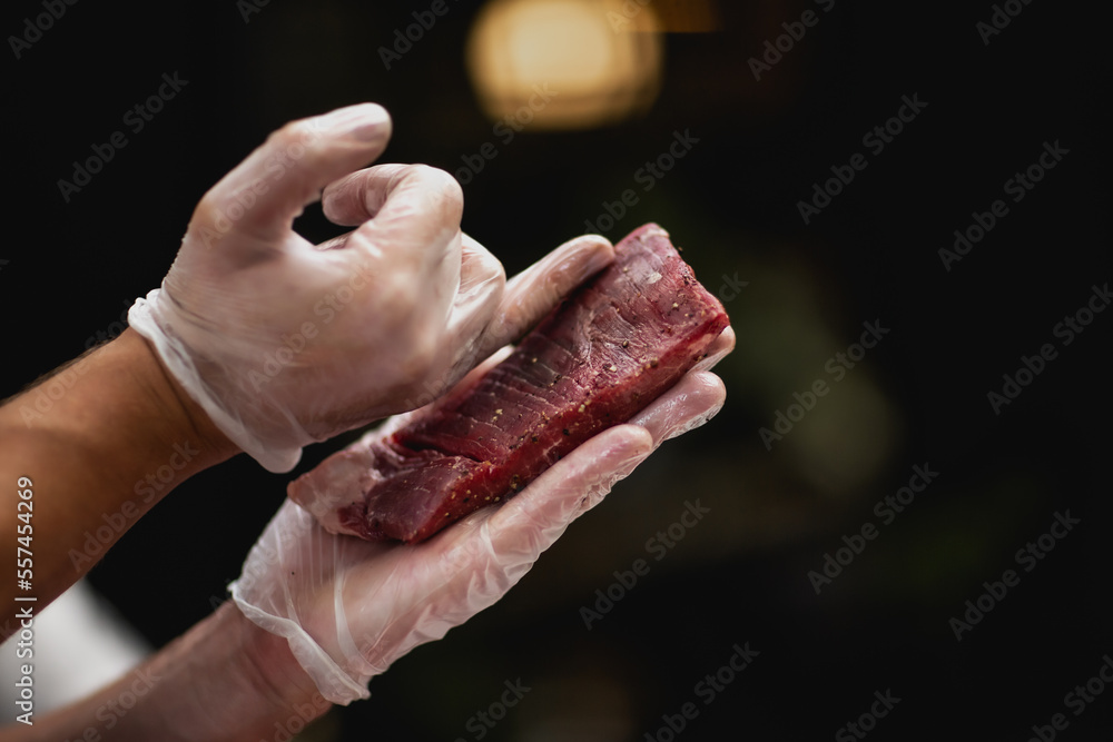 Chef pointing out details of steak fillet meat cut with rubber gloves on. Riga, Latvia