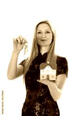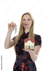 Business woman advertises real estate on isolated background