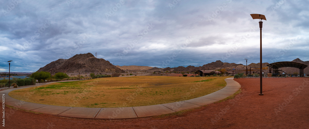 Colorado River Landscape Series, at Bullhead Canyon Park with dramatic stormy cloudscape, curving footpath and lawn, and street lamps, in Laughlin, Nevada, USA