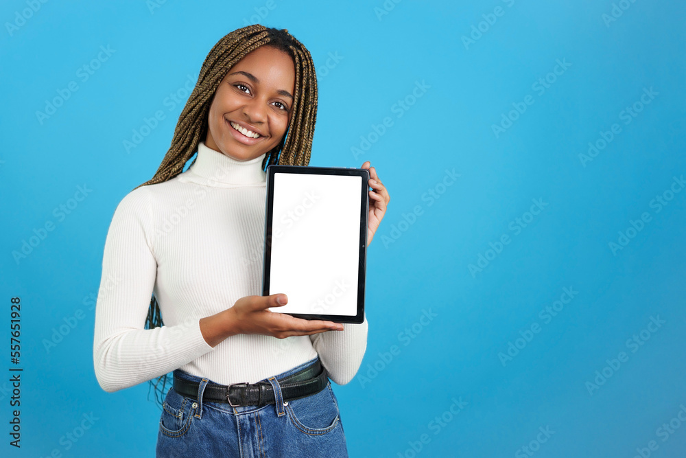 Smiling african woman showing the screen of a digital tablet