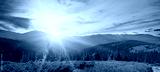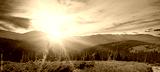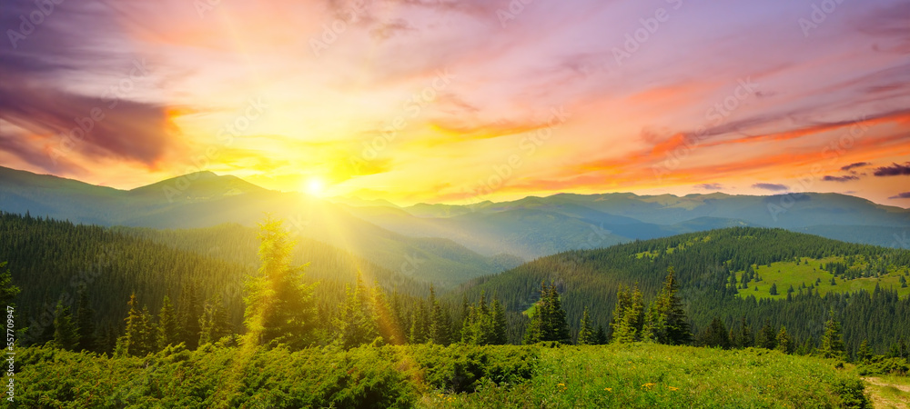 Vibrant mountain landscape with mountain peaks, forests and sunset. Carpathians. Ukraine. Wide photo.
