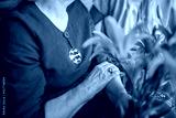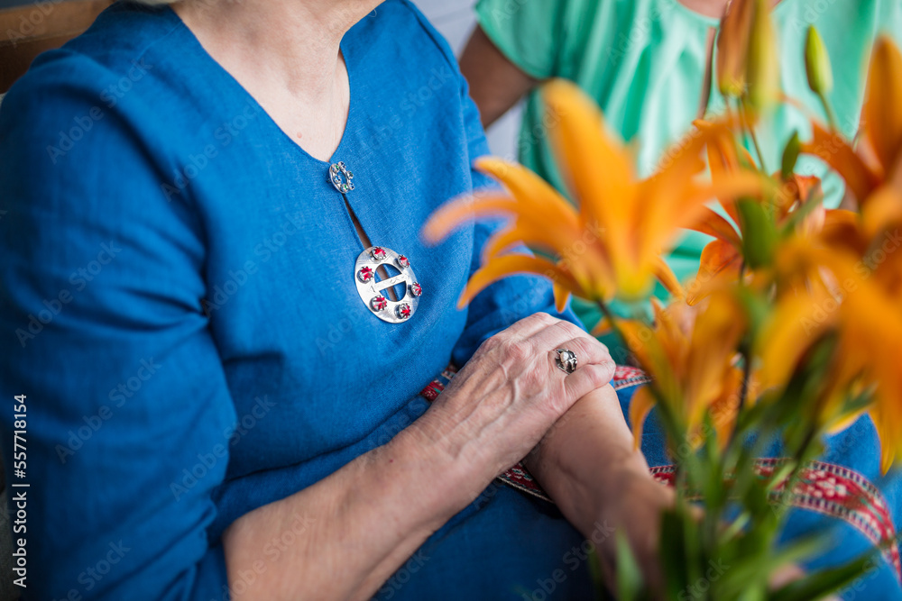 Older woman dressed in traditional blue linen dress with amber national Latvian and Baltic symbol silver jewlery and ring