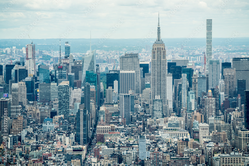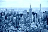 Blue misty aerial high view of midtwon New York city midtown buildings in afternoon