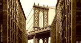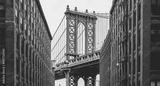 Red brick buildings with Brooklyn bridge sprouting between them, New York