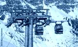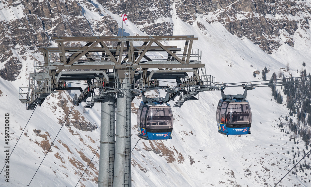 Gondola lifts in snowy Austrian Alps glacier Hinter Tux