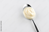 Mayonnaise. Spoon of homemade healthy mayonnaise sauce, soft cream. Healthy food ingredients. on white background. Salad dressing.
