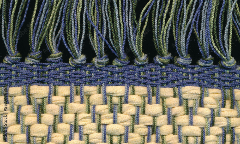 Closeup of ending with carpet fringes on handwoven rag rug.