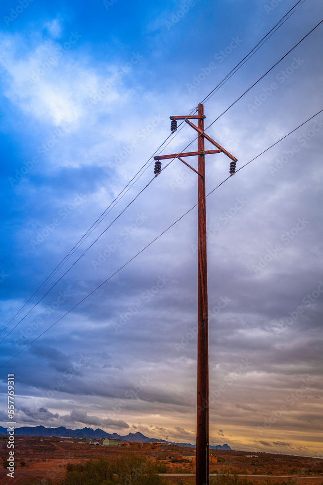 Electricity pylons and cables with stormy clouds over the road in the desert meadow in Bullhead, in Bullhead City, Arizona, USA