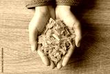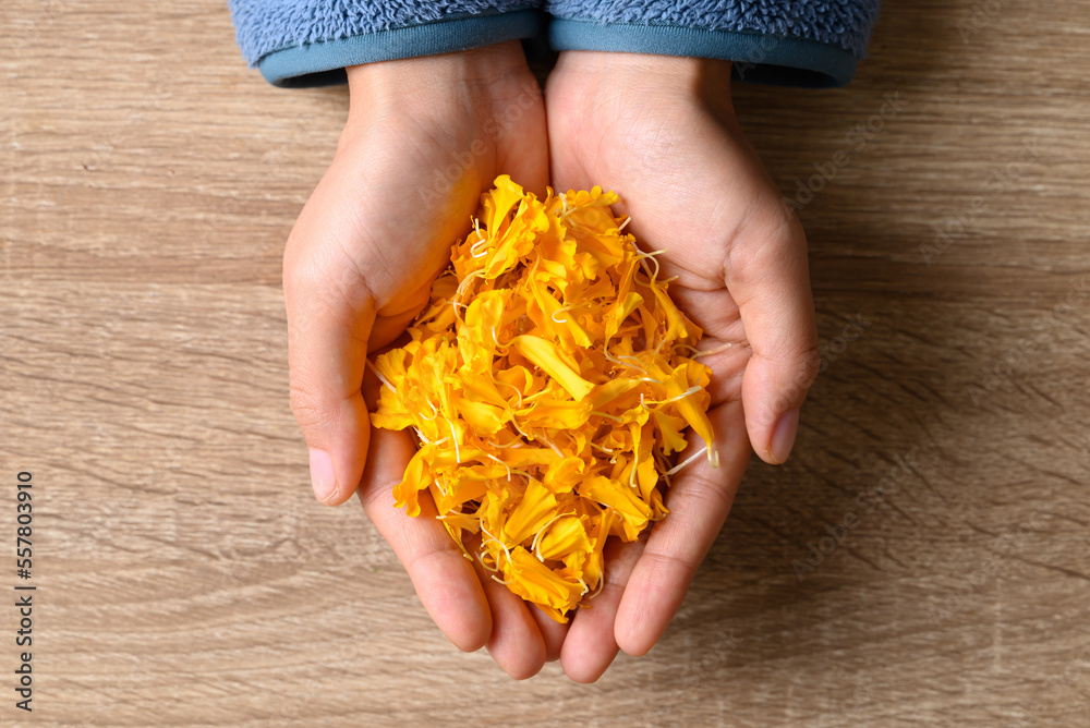 Yellow marigold flower petal in hand on wooden background, Spiritual flower