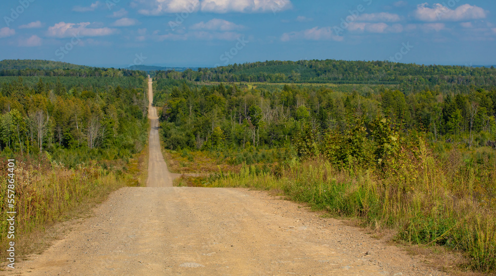 Dirt road through a thick Maine Forest