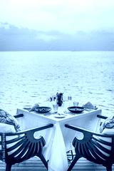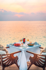Seascape view under sunset light with dining table with infinity pool around. Romantic tranquil getaway for two, couple concept. Chairs, food and romance. Luxury destination dining, honeymoon template