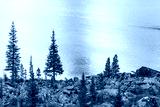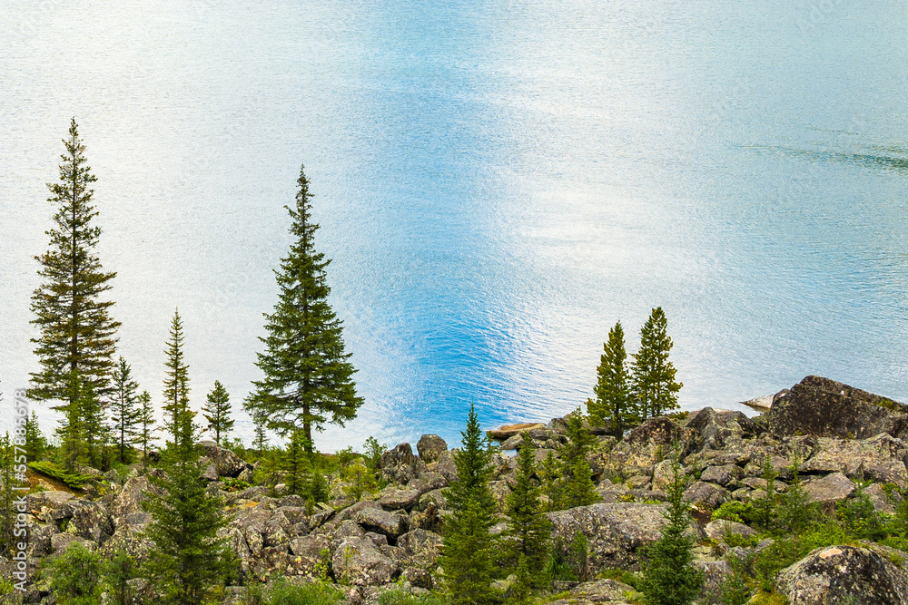 Beautiful view of the shore of mountain lake with reflection of blue sky in the water