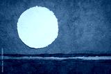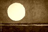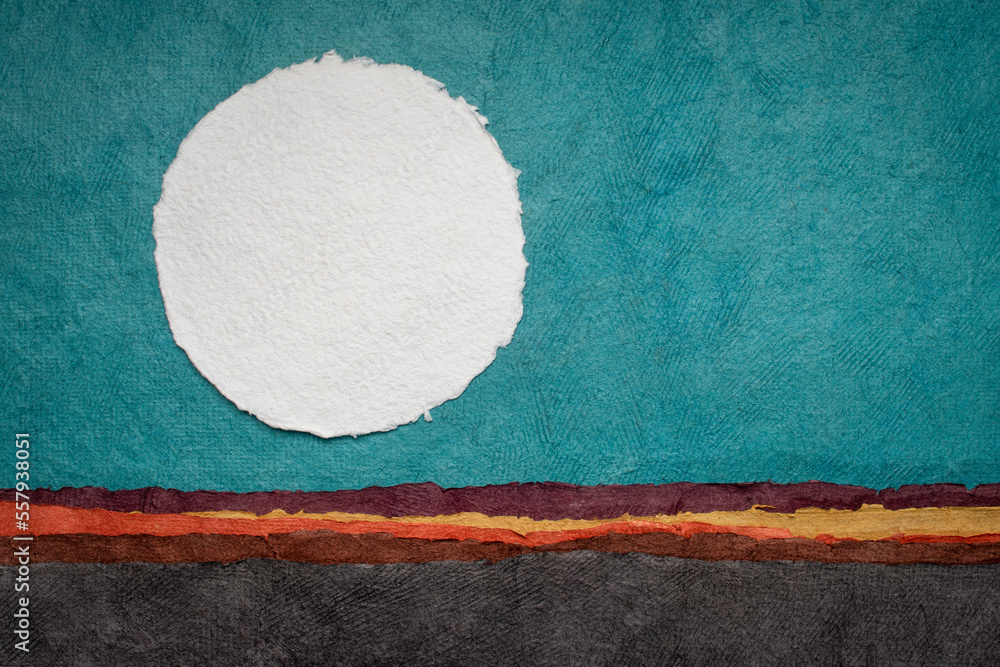 moon or sun rising over abstract colorful landscape, blank circular watercolor paper