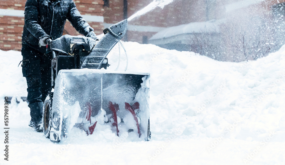 a janitor on a snowplow removes snow in the courtyard of a residential building
