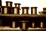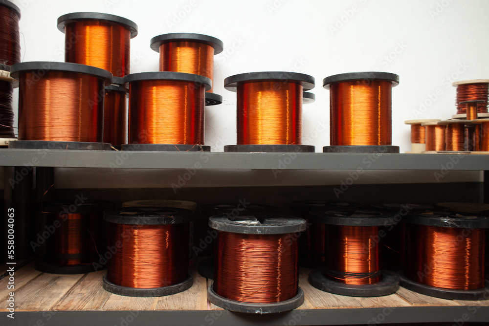 many coils of copper wire in the production workshop, winding copper cable on spools