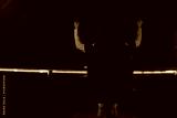 gamer in a computer chair plays a computer game at night, the player raises his hands and rejoice in victory