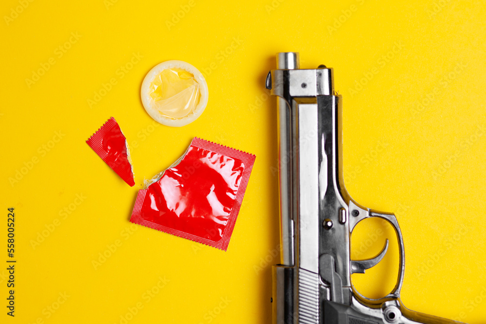 open condom lies on a yellow background near the muzzle of a gun, the concept of safe sex
