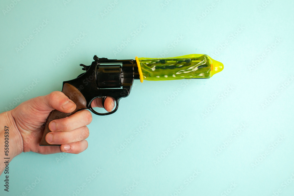 hand holds a gun dressed in a yellow condom on a blue background, the concept of erection, concept of safe sex